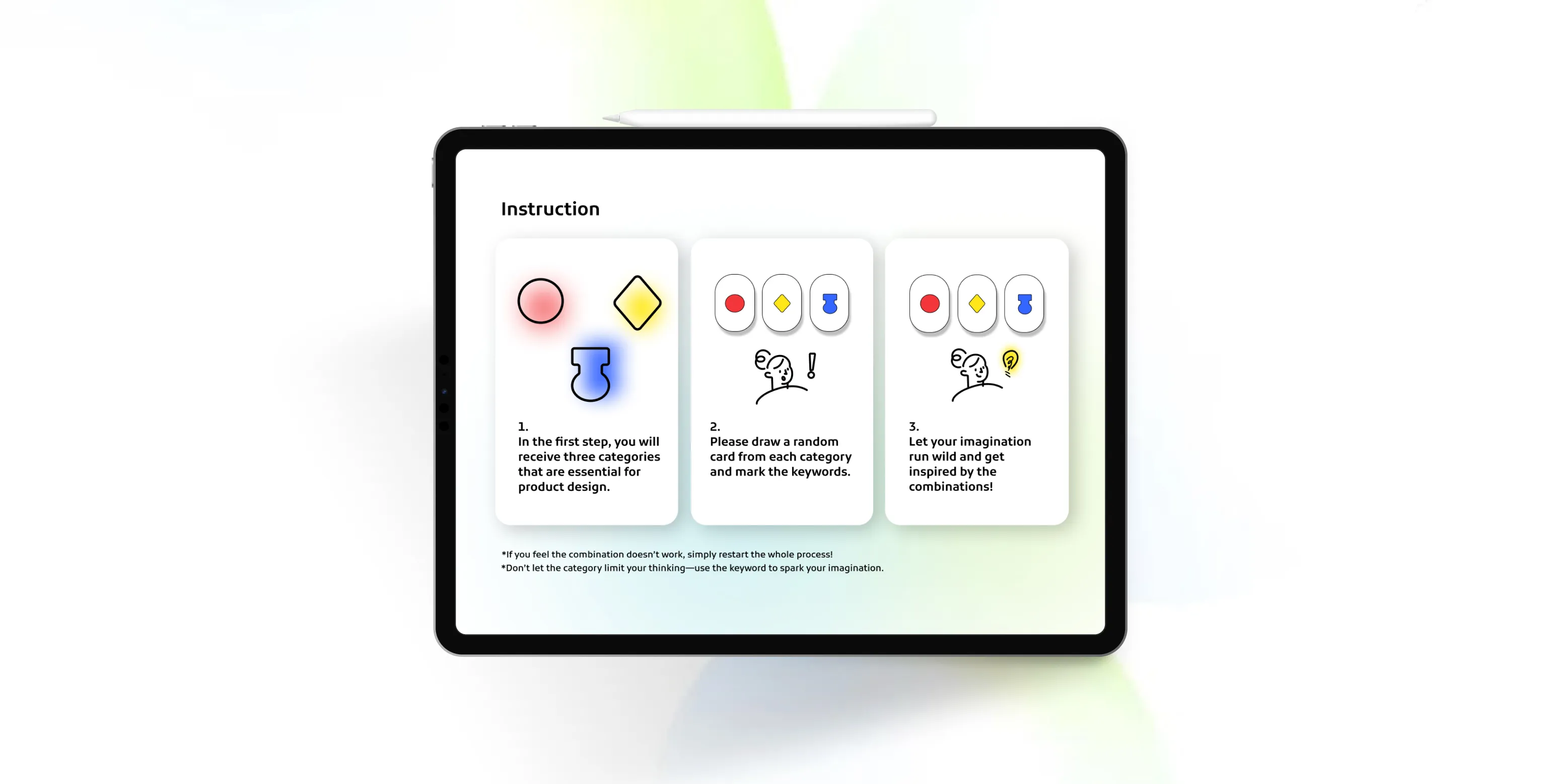 Each participant draws six random keywords—one from each category—and creates a design concept based solely on these keywords.